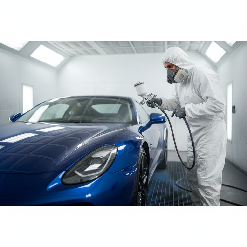 Préparation soignée, peinture constructeur et vernis pour un rendu uniforme et une finition impeccable.